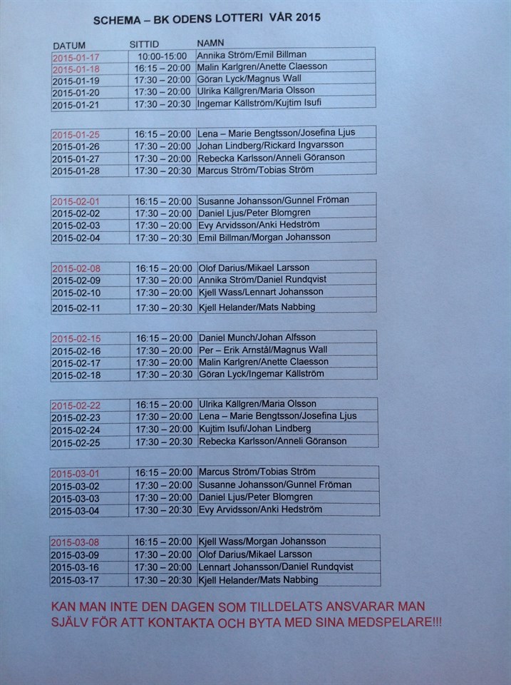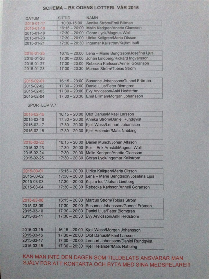 Ordförande, sekreterare och kassören har beslutat att vi ska köra 2 lotterier på rad då vi ej hann sitta under hösten! Se schemat för sittider, de första 4 veckorna är oförändrade! Kan man inte den dagen som tilldelats så ansvarar man själv för att byta med sina medspelare!!! / Anki och Annika