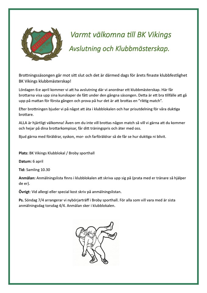 Hej alla!! Här kommer en inbjudan till avslutningen. Hoppas vi ses Avslutning Killar Nybörjare 25 mar 2024 0kommentarer