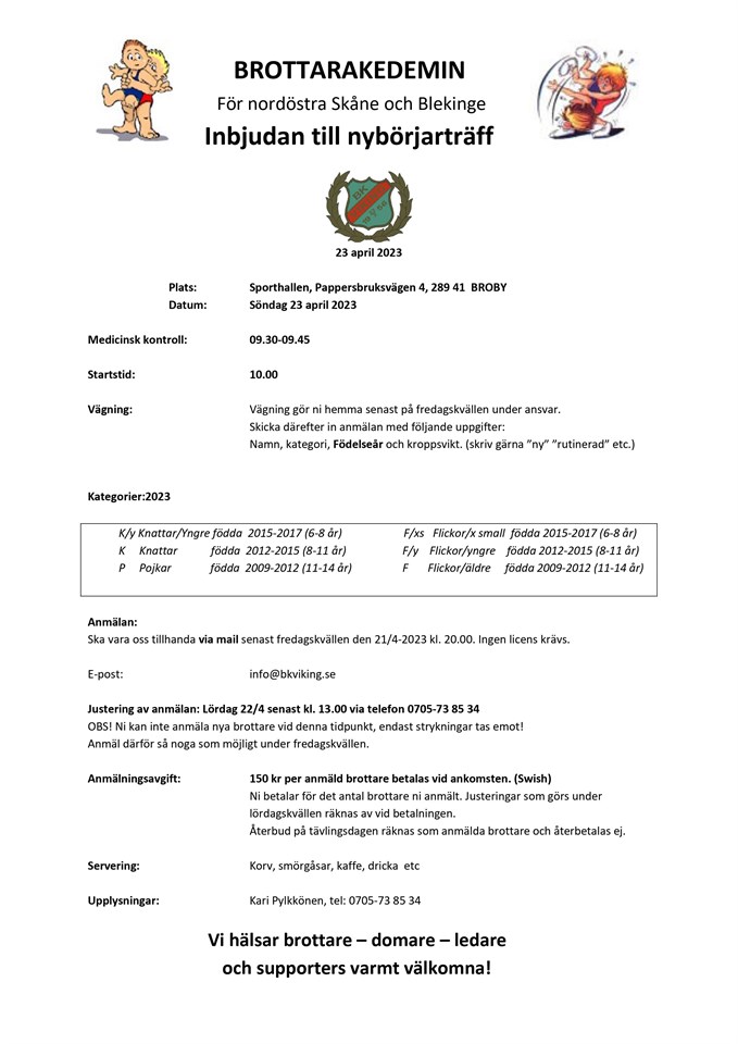 Hej! Nu är det dags för nybörjarträff i broby sporthall den 23 april. Vi vill att så många som möjligt är med och tävlar. Skriv upp er på listan i klubblokalen. Vi kommer även behöva hjälp att bemanna koisken under dagen och lägga ut och ta undan mattorna. Skriv gärna upp er i klubblokalen om ni har möjlighet att hjälp till. Så ser vi fram emot en rolig dag tillsammans! Killar Nybörjare 1 apr 2023 0kommentarer