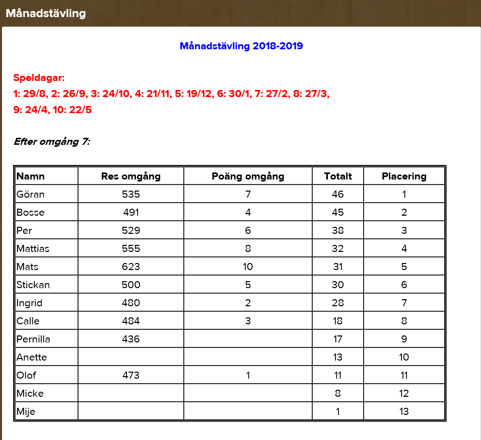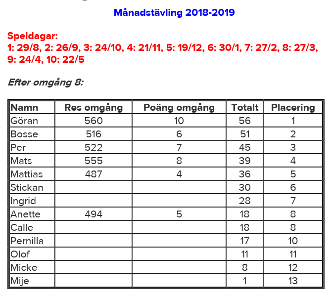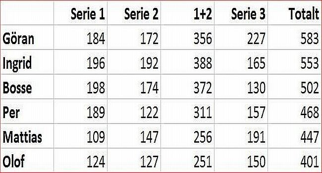 Mats vann i stor stil på 623 före Mattias på 555 och Göran på 535. Bosse hade en mindre lyckad dag och slutade på 491. Det gav honom 4 poäng och han blev därmed nedflyttad av Göran från förstaplatsen. För samtliga resultat, se bilden och för aktuell ställning se här. Väl mött i Karlsrohallen ! Webredaktör Stickan BK Znax 8 mar 2019 0kommentarer