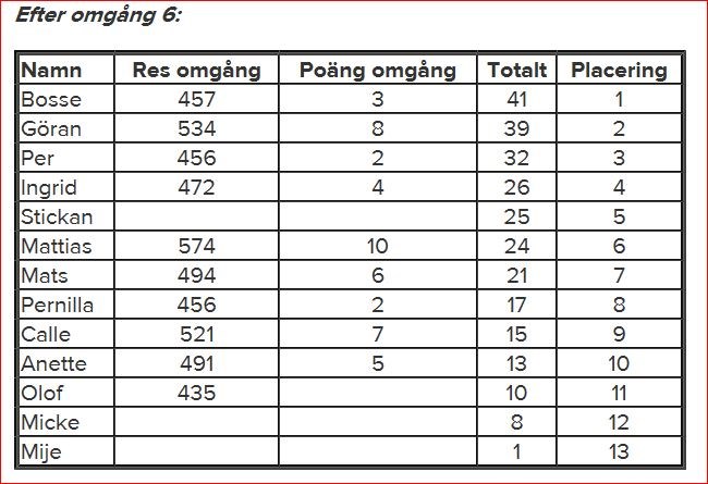 Bosse började bäst. I andra hade Ingrid tagit ledningen. Men - till sist - var det Göran som tog hem segern ! Det var bara sex deltagare och därmed blev det fyra poäng till "grindstängaren" Olof även om han säkert inte var nöjd med slutresultatet... För hela redovisningen - se bilden eller för nuvarande ställning - se här. God Jul och Gott Nytt År !!! Webredaktör Stickan BK Znax 20 dec 2018 0kommentarer