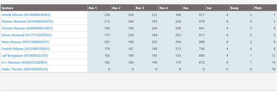 I månadsfinalens åttonde omgång vann Göran på 635 före Christers 536 och Olofs 520. Det innebar ingen förändring i totalställningen förutom att Olof tog fjärdeplatsen från Mats - det skiljer ynka en poäng (42 mot 41) ! Aktuell ställning hittar du här Väl mött i Karlsrohallen ! Webredaktör Stickan