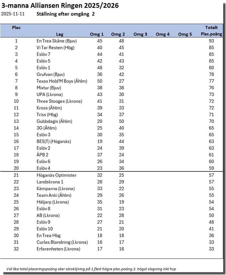 Något överraskande leder En Trea Skåne från Bjuv efter 2 omgångar av 3-mannatävlingen inom Alliansen Ringen, I laget ingår redaktören själv (Loa) jämte Olga Andersson, Håkan Berglund och Christer Mårtensson.