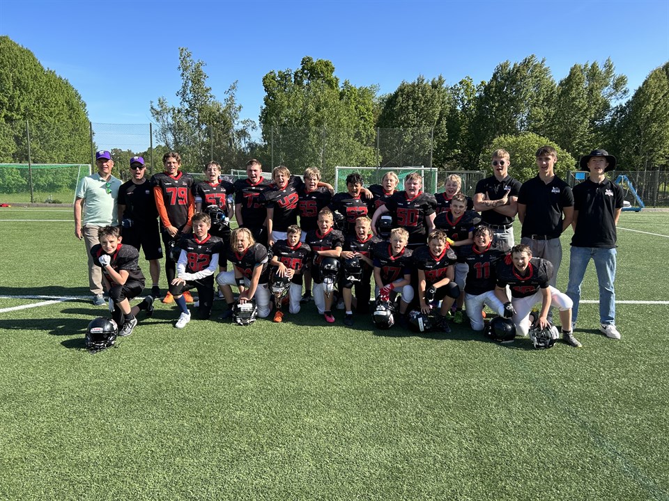 Då var första cupen och matchspelsdebuten avklarad för grabbarna! En riktig succé, inte minst med tanke på att 9 av de 12 spelarna aldrig matchat någonsin tidigare. Dagen startade tidigt ute på Rosta Gärde där förväntasfulla men trötta spelare och ledare samlades och gemensamt fyllde lagbussen med matsäckar, matchkläder, skydd och hjälmar. 3h senare väl framme i Tyresö mötte vi upp dagens samarbetslag Maniacs från Beckomberga. Därefter började det obekanta stöket med att få rätt storlek på utrustningen och krångla i och på skydden i matchbyxorna. Så var det då dags för premiär, Stockholm Mean Machines. Grabbarna konstaterade tidigt att motståndet såg välvuxet ut, nervöst! Men det släppte helt bara minuter efter slantsingling då Viktor B sprang in dagens första touchdown. Efter det krigade vi oss vidare till årets första vinst. Fantastiskt (och välförtjänt) glada grabbar! Match 2 visade sig bli av tuffare karaktär, där Tyresö visade sig vara ytterligare snäppet större och även mer samspelat än vår Örebro/Beckomberga-kombo. Pga stök i spelschemat blev vilan från premiären i princip obefintlig; blodsockerfall, stekande sol och hårda tacklingar från en skicklig motståndare tog hårt på gänget. Förlust med många poäng, men efter ett gott pep-talk, fin sammanhållning, en dryg timmas vila och lite köttbullslunch så var humöret och energin åter på topp. I dagens sista match mot dittills obesegrade Carlstad Crusaders visade grabbarna upp en magisk lagmoral och revanschlusta mot matchen innan. Vi tog tidigt ledningen efter fint springspel, därefter klev försvarsuppställningen in och tog över showen och höll duktiga Carlstadspelare kort. Mot matchslutet sågs inte många debutanttecken kvar, grabbarna hittade rätt i position och satte de flesta fötter och tacklingar rätt. Men med några otursamma domslut och ett duktigt lag emot oss kom till slut en sen kvittering, varpå oavgjort också blev slutresultatet. Något som firades med cola & kexchoklad innan dagens sista och högsta break (1, 2, 3, Black Knights!!!!). Påtaglig stolthetskänsla från oss i ledarstaben och även grabbarna själva. För endast ett par veckor sedan hade majoriteten av grabbarna inte ens sett eller deltagit i någon form av match och därtill inte känt varandra innan. Nu en utopisk lagmoral, sammanhållning och fin resultatrad med hem i bagaget. Trötta men oerhört nöjda grabbar avslutade vår första heldag tillsammans med välförtjänt hamburgarmiddag innan bussen och bilarna rullade hemåt mot Örebro. Vi ledare vill skicka med er föräldrar att berömma era grabbar för utomordentligt gott uppförande. Vår sport innebär alltid svett och lite tårar, oavsett med- eller motgång. Laget före jaget är därmed parollen, vilket tydligt visades upp av samtliga såväl utanför som på planen. Laget vill även passa på att skicka med ett extra stort TACK! till Johan Skuthälla (Julius farsa) som via sitt eminenta SBS Säkerhet sponsrade oss med såväl Lagbuss, Vattenflaskor, kexchoklad och läsk! Påminner om att nästa och vårsäsongens sista träning hålls på Torsdag 15/6 kl18. Därefter två veckors Summercamp för de som kan och anmält sig till det. Därefter tar vi sommarlov hela juli. Höstsäsongens träningar drar vi igång med 1:a augusti! Som tidigare uppmanar vi till att bjuda in och med fler fotbollsintresserade kompisar att prova på, vi vill bli fler! Go Black Knights! Vid pennan (& ratten på lagbussen) Mackan