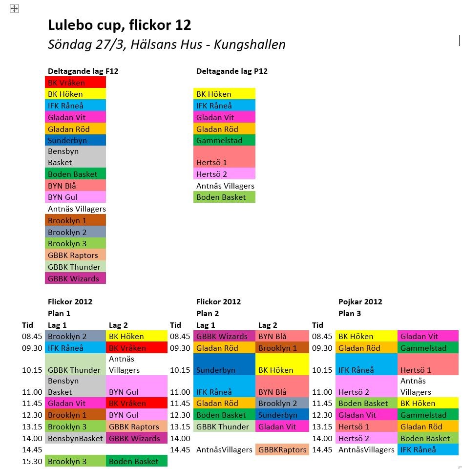 Hej på er! Här kommer spelschema för flickor och pojkar födda 2012. Vi kommer alla spela våra matcher på söndag 27/3 i Hälsans Hus-Kungshallen. Det kommer vara tre basketplaner i gång samtidigt, tjejerna spelar på plan 1-3 & killarna på plan 3. Arrangör och som även dömer är Luleå Basket ungdom. Vi kommer att träffas ca 30 min innan match för att byta om och värma upp oss innan matchen. MVH, Oleg