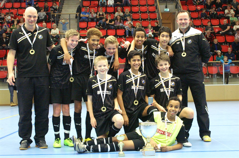 Världens bästa kvartersgäng har slagit till igen, denna gång i sveriges största inomhuscup. Det började i torsdags med gruppseger efter 3 raka segrar i gruppen, i lördags fortsatte det med slutspelsgrupp som även den vinns efter 2 segrar. Även kvartsfinal och semifinal sluter med vinster. Slutligen stod vi i final för andra året på raken i ST-cupen, denna gång med Mälarhöjden som motståndare, ett lag som vi hade rätt dålig koll på. Mälarhöjden spelar en rörlig fotboll med stora forwards kombinerat med någon supertekniker, vi var dock förvarnade och stampade gasen i botten från början med ett tydligt mål att sätt hög press och störa deras uppspel. Anfall är som bekant bästa försvar. Vi har ett par riktigt fina chanser innan Oscar kan stänka dit 1-0 målet. Khadar håller sig framme någon minut senare och bombar in 2-0 som också är resultatet i halvtid. Andra halvlek fortsätter på samma sätt, stort spelövertag för Bromsten och Mälarhöjden sticker mellan med lite halvchanser. När Adam sätter dit 3-0 med 5 minuter kvar så känns matchen klar men det blir lite rörigt när vi bjuder på 3-1 reduceringen efter en liten komunikationsmiss i vårt straffområde, men segern är aldrig hotad. Bromsten får välförtjänt lyfta den fina ST-cup pokalen och Adam får priset som matchens lirare...........så himla skönt, det här gänget är verkligen värt en stor framgång. Statistiken talar sitt tydliga språk, 8 matcher, 8 vinster, 21 gjorda mål och endast 3 insläppta. Alla nio killar har spelat lika mycket genom hela turneringen, bytena har dom skött själva. Vi tränare har i princip bara kunnat sitta och njuta av den fina underhållning vi bjudits på. Inramningen på finalen var fantastisk med en härlig hejarklack på läktaren, krama om era hjältar extra mycket ikväll. Annas bilder finns redan på nya picasa