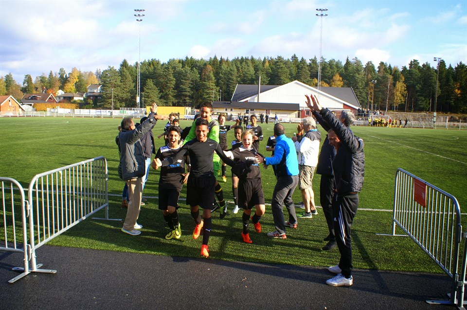 Årets målsättning var solklar, vi skall göra ett seriöst försök att ta oss till Elit efter förra årets knepiga 9-mannasspel. Konkurrensen i P14 div2 är knivskarp och vi är en liten förening med få spelare. Vi visste att det skulle bli tufft framförallt när förkylningsperioder och skador slår till, vi har bara ett lag och en trupp, vi kan inte låna in spelare när det kniper. Vi beslutade att inte spela någon mer serie än P14 2A, allt fokus på den, varje match, varje mål, varje poäng räknas. De större föreningarna har ett bredare spelarmaterial att jobba med och det märks tydligt nu när puberteten slår till och ger en muskel och kiloboost, för varje match vi spelar blir motståndarna större och större. Självklart växer vi också. Vi gick till sommarvila i serieledning men med både BeleBarkarby och BP 00-2 hack i häl. Till höstsäsongen tappade vi 3 st spelare varav 2 st gick rakt in i startelvan i akademilagen AIK resp Vasalund, det är klart att det påverkar oss, helt plötsligt stod vi med en trupp på 12 man och hade tappat några tunga pjäser. Som tur var kunde vi fylla på truppen med Ali,Alperen, Rickard och Eros. Hela höstsäsongen har vi målmässigt balanserat på en skör tråd med flera uddamålssegrar och kryss. Men det finns ett go och en vilja i det här laget som slår det mesta, killarna ger aldrig upp och viker sig inte. Alla matcher på slutet har varit stentuffa, vi har inte fått slappna av en sekund, BeleBarkarby har hela tiden jagat oss i tabellen. I näst sista matchen mot Sollentuna kunde vi säkra seriesegern vid vinst, nu blev det inte så utan vi fick nöja oss med ett kryss och självklart ska allt avgöras i sista matchen. I sista matchen stod IK Frej för motståndet, ett Frej som gått som tåget efter sommaruppehållet, ingen lätt uppgift med andra ord. Till råga på allt en morgonmatch borta i Täby. Vi tänkte att här gäller det att få upp killarna tidigt och se till att alla ätit frukost, så vi samlades i klubbhuset redan kl 07:45 för gemensam frukost. Ett kryss skulle räcka för serieseger så vi gjorde något som väldigt sällan inträffat i kvartersgängets historia, vi skulle se till att vara extra rädd om vår nolla och se till att ligga på rätt sida. Det blir trots allt en ganska öppen match men vi är väldigt noga med att jobba hem, vi skapar en hel del bra chanser. 2 x 30 min går ibland extremt långsamt men tiden jobbade för oss. Med ca 10 minuter kvar kan Abdi rulla in 1-0 målet i något som får beskrivas som ett riktigt skitmål, men jag tycker att vi hade jobbat ihop till det riktigt kul att Abdi får sätta dit den. Otroligt skönt, sedan väntade 10 minuters nervpärs. När slutsignalen ljuder så blir det inte det stora segervrålet, det blir mer en suck av lättnad och det beskriver hela säsongen ganska väl, det har varit mycket på våra axlar. Efter en stund kryper den sköna vinnarkänslan på oss och vi firar med tillresta supportrar. Laget har gjort en enastående säsong. Vi är det enda lag i div 1 och div 2 som är obesegrade. Stort grattis till hela laget och tack till P-a, Romeo och Georgios som jobbat stenhårt med killarna. Stort tack till alla föräldrar och anhöriga som stöttar oss. Extra tack till BeleBarkarby som jag tycker spelar kanonbra fotboll och har gett oss en rejäl match i år, Bele är min moderklubb och jag är säker på att ni tar steget upp nästa säsong. Jag vill även tacka BP00-2 som valde att ge oss och Bele en chans att göra upp själva utan att blanda in så många spelare från BP00-1 under hösten.