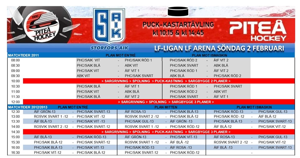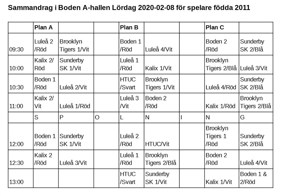 Hej! Vill börja med att tacka för ert deltagande idag, bra kämpat! Här kommer spelschemat inför lördag den 8/2 i Boden. Lagindelning kommer senare i vecka. mvh Ledarna