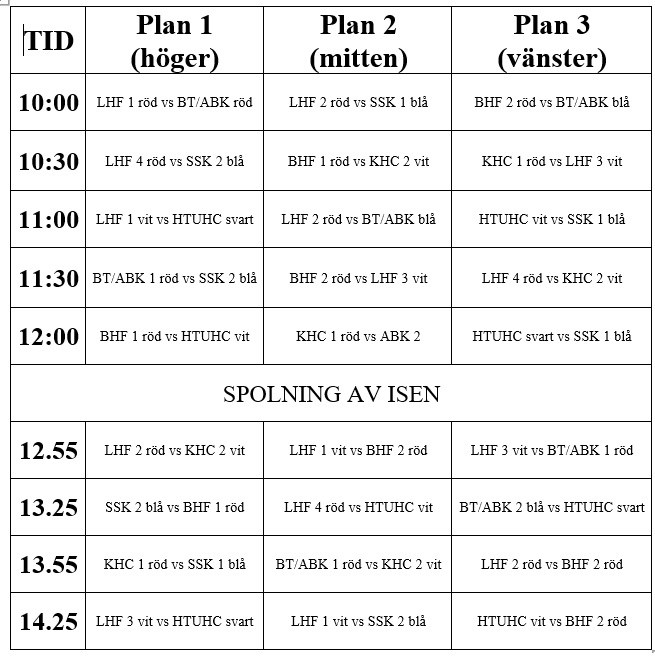 Hej! Nu är spelschemat klart för nästa helg. Se bifogad fil. Övrig information Plats: Coop Arena B-hallen Datum: Lördag 9 nov Tid: Kl. 10-15 Isen kommer vara indelad tvärs över till 3 planer. Sett från läktaren kommer det vara Plan 1 åt höger (mot omklädningsrum), Plan 2 i mitten, Plan 3 åt vänster (mot klocka/fik). Matcher kommer att pågå från kl 10 till kl 15. Isen kommer vara tillgänglig från 8.45. Det finns alltså visst utrymme att värma upp på is före matcherna om så önskas. Uppehåll vid 9.45 till första matchstart för spolning av isen. SPELFORM Lagen spelar med 4 utespelare + 1 målvakt 1x24 min Klockan rullar hela tiden Fasta byten varannan minut, vid given signal från sekretariatet. Byte under spel sker endast vid skada, ledare får beträda isen. Vid byten: ’släppa ut först o ta in sen’ TRÖJFÄRGER LHF 1 och 3 Vit LHF 2 och 4 Röd SSK 1 och 2 Blå BT/ABK 1 Röd BT/ABK 2 Blå KHC 1 Röd KHC 2 Vit HTUHC svart HTUHC vit BHF 1 och 2 Röd FÖRTÄRING Det kommer finnas ett fik som har öppet under hela tiden, det ligger längst in på läktaren. Det kommer finnas hamburgare, varmkorv, kaffe, fika, dricka m.m. Det kommer även finnas möjlighet att köpa lotter och vinna lite olika småvinster, godis etc. Vänliga hälsningar Malin Blomqvist Lagledare LHF team – 11 Tel 072 20 84 256