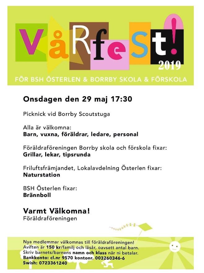 Vi bestämde i förra veckan att boll och lek gruppen med barn födda 2014 skulle ha sin avslutning på torsdag 30/5 men då flera barn har fått förhinder skjuts detta fram. Det blir en gemensam avslutning med Elins grupp den 13/6. Planering: Ons 29/5 Vårfest vid Borrby scoutstuga för BSH-spelare med familj. Se bild! Tors 30/5 Kristihimmelfärds dag - Ingen träning Tors 6/6 Nationaldagen – Ingen träning för 2014 gruppen, Elins grupp har träning som vanligt. Tors 13/6 Avslutning kl. 17.15 På avslutningen bjuder vi in hela familjen på lite spel och fika. Var snäll och smsa oss hur många som kommer från varje familj samt eventuella allergier. /mvh Sara 0768-769829 Om du tillhör Elins grupp sms:a henne ang. avslutningen 070-3623644