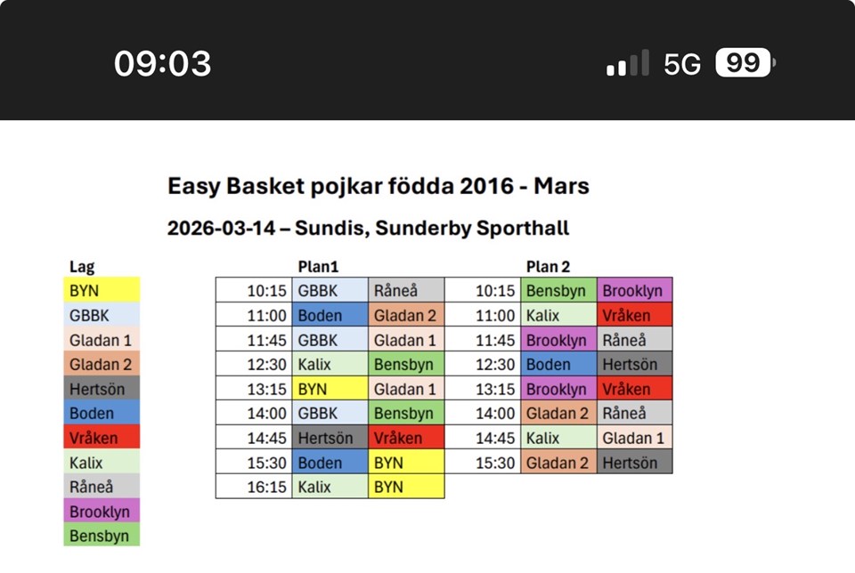 Hej, nu har vi fått schemat för lördagens sammandrag i Sundishallen, Sunderbyn.