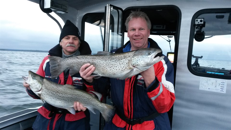 Då var det dags för fiskeresan vi fick, av er tjejer och föreningen. Vi övernattade på Hemgården i Bengtsfors, och på morgonen vid frukosten gjorde vi vår matsäck inför en en heldag med fiske på Vänern. Vår fiskeguide Tommy Nerstarand kom som avtalat kl. 07.00. Vi sjösatte vid Tössebäcken och gick ut förbi skärgården och snart hade vi riggat upp 10 spön med Löja (som vi skulle trolla med), vi bestämde att Birger skulle ta första nappet och det kom ganska snart, men tyvärr så lossade fisken, nästa kom tätt därefter och det var mitt, men tyvärr var det en Gädda...... Sen körde vi i Måsdyk och i helt perfekta förhållande (förutom 2-3m sjögång...) i timmar men inget hugg. Men när vi nästan gett upp hoppet och var på väg hemåt vid 14.30, så smäller det till på djupriggen och Birger kan landa en riktigt fet och grann öring på 71 cm och drygt 4 kilo, under tiden Birger håller på och kämpar med sin, så hugger det på ett ytspö och jag blir också lycklig fiskare idag med en öring på 4.8 kg. En blåsig, men härlig dag på Vänern. Tack skall ni ha // Birger o Martin.