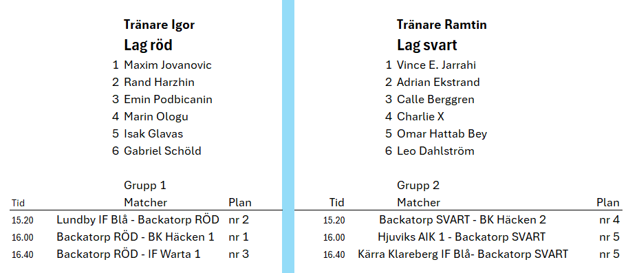 Hej, Detta meddelande är till de som anmält sig enligt nedan till sammandraget 4 okt på Backvallen. Ni övriga är välkomna på söndagens träning kl 09,00 Lilhagsparken. Vi samlas 30 min innan första match utanför klubbstugan på Backavallen. Se bifogat spelschema med tider m.m. Måste man tacka nej pga sjukdom etc, kontaktar man någon av oss tränare Igor 0707 558825 Ramtin 0738 604865 Lag röd Maxim Rand Emin Marin Isak Gabriel Lag svart Vince Adrian Calle B Charlie Omar Leo Dahlström P-2019 Fotboll 29 sep 2025
