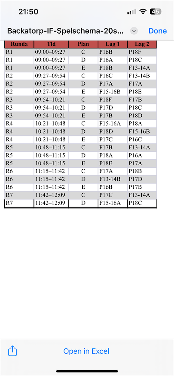Dagen börjar kl. 09.00 för vissa lag, de har samling kl 08:40. P18E spelar 09:27, samling 0900