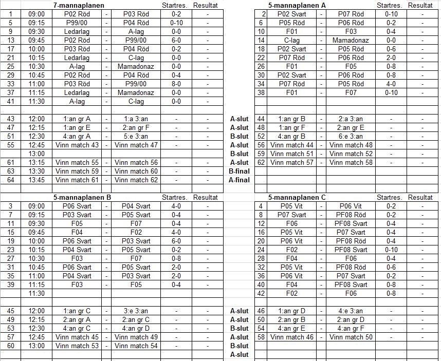 Vi samlas kl 8:40 och första matchen är kl 9:00.
