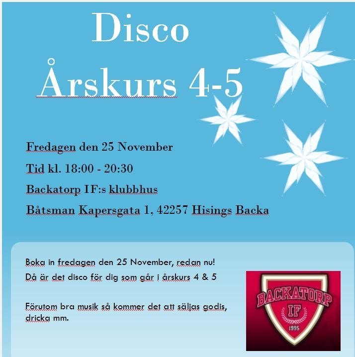 Hej På fredag är det dags för P06-Disco. Alla killar inklusive deras klasskompisar, kompisar mfl är välkomna till klubbhuset för att dansa, prata, leka, äta godis och ha roligt. Spelarna skall inte behöva hjälpa till och jobba utan skall endast ha kul tillsammans med sina kompisar. Gäller årskurs 4-5. Sprid gärna detta budskap till alla berörda! PS: vi har en liten föräldrainsats som hanteras via vår föräldraansvarige Johan Eklund. //Ledare & Spelare P06
