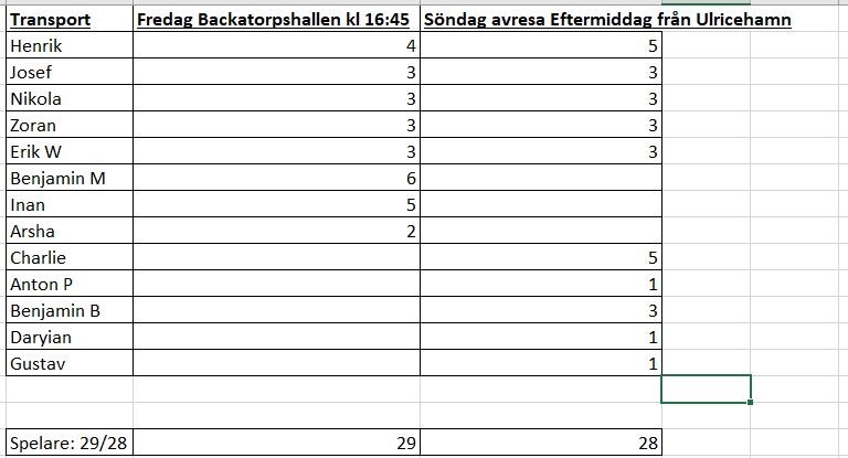 Hej, Till helgen beger vi oss till Ulricehamn och Lassabollen : Spelschema OBS! se transportschema för ditresa på fredagen respektive hem på söndagen. Viktigt att ni hör av Er om det mot förmodan strular då detta påverkar hur killarna kommer till Ulricehamn Matcher både på lördagen och söndagen! Samlingstid 16:30 för gemensam avfärd ca kl 16:45 - Backatorpshallen. OBS! ta med egen matsäck för att äta på fredagskvällen då ingen mat ingår då. Hemkomst någon gång på eftermiddagen söndagen 22 aug. (meddelas via hemsidan när det är aktuellt) Att ta med som spelare: • Utrustning fotboll: skor, benskydd mm • Vattenflaska • Sängkläder, sovsäck, kudde • Luftmadrass eller motsvarande liggunderlag • Hygiensaker, tandborste mm • Handduk • Träningsoverall eller liknande, bekväma kläder, skor/tofflor * Röda strumpor/Svarta Shorts till matcherna * Matchströja (matchtröjor till nya spelare fixar vi) * Regnöverdrag (behöver förhoppningsvis inte användas) * Badbyxor • Mobil/Ipad lämnas hemma. (vill man ringa hem så få de låna våra mobiler alt att ni föräldrar vill prata med killarna så ring bara oss ledare. Se nr under kontakt * Maxbelopp i fickpengar: 100 kr Spelare/ledare lag 1: Zoran/Nikola + Filip, Anton C, Erik T, Benjamin B, Albin, Viktor, Arsha, Elias, Joseph, Daryian, Gabriel, Benjamin M Spelare/ledare lag 2: Stefan/Josef/Henrik + Lukas, Ossian, Erik W, Vidar, Inan, Gustav, Charlie, Anton P, Arvid, Hugo, Elliot, Hamza PS: ändringar i lagen kan ske under veckan. Återkom till oss ledare om ni har några frågor Kul med CUP! //Ledarna P09