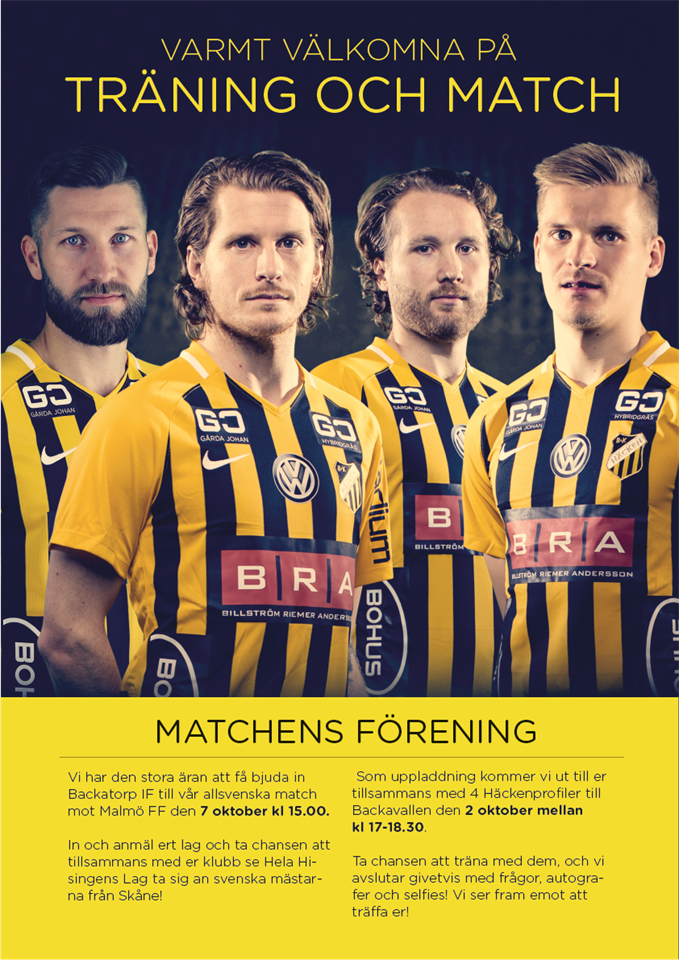 Matchens förening - Backatorp IF => allsvenskan Häcken- Malmö FF BK Häcken har förmånen att bjuda in er förening till vår Allsvenska match mot Malmö FF den 7 oktober. Vi bjuder alla spelare och ledare på biljetter. Föräldrar som önskar anmäla sig får köpa biljett till ett fast pris på 100 kr. Biljetterna erhålls på arenan vid ankomsten med buss. Anmäl dig och ditt lag via formuläret nedan! Vi samlas vid Backatorps klubblokal kl 13.45 där vi tar er med buss till Bravida Arena. Vi räknar med att vara tillbaka vid klubblokalen efter matchen ca kl 17.30. På plats har ni tillgång till vår barn- och ungdomshörna, Stickans Corner, där vi erbjuder Playstation och skottborg för de äldre, samt pyssel och lek för de lite yngre. Dagen till ära så firar vi även vår maskot Stickans födelsedag med tårta och disco! Ni sitter tillsammans på vår ungdomsläktare på sektion H, i direkt anslutning till våra fans på sektion G. Vi hoppas givetvis att ni hjälper till och bidrar till en fantastisk stämning på Bravida Arena! Deadline för anmälan är fredag 5/10 klockan 12:00. Länk till biljetter för Föräldrar (Vi ledare lägger in för spelare enligt anmälan på laget.se) FÖRÄLDRAR: Efter lagd anmälan ber vi er swisha priset för biljetten/biljetterna till nummer 1230973305. Alternativ använd QR-koden nedan. Vid problem ber vi er kontakta Martin Ericsson på martin.ericsson@bkhacken.se Väl mött! Hälsningar BK Häcken via Backatorp IF