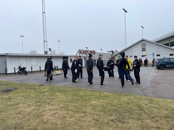 Laget håller på med uppvärmning och samlar sig för en tuff kamp! Vädret är inte med oss men det skiter vi i, nu kör vi💛