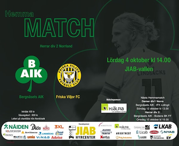 Lördag 4 oktober kl. 14.00 möter BAIKs herrar Friska Viljor FC i div.2 fotbollen.