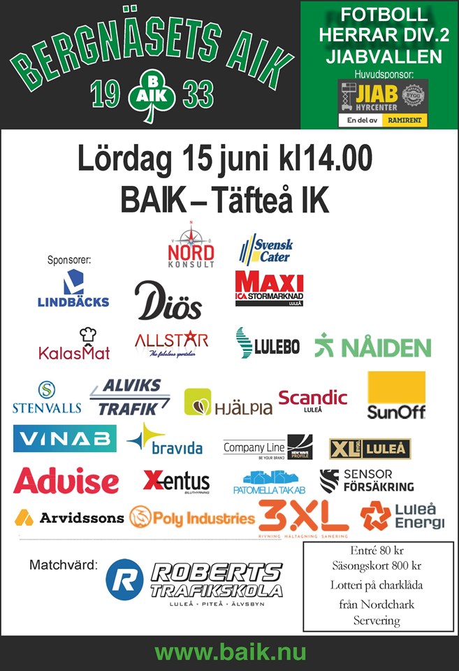 Vi hoppas på ett revanschsuget hemmagäng på lördag 15 juni när vi tar emot Täfteå IK hemma på JIABvallens naturgräs. Vi föll med 2-1 i vårens träningsmatch och gjorde nen slätstruken insats. Matchvärd är Roberts Trafikskola och charklådan kommer från Nordchark. Välkomna! Fotbollsektionen 12 jun 2024 0kommentarer