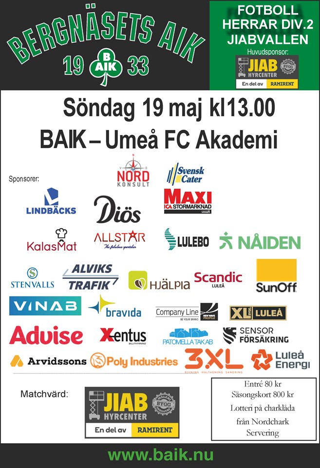 Söndag 19 maj kl. 13.00 möter BAIKs herrar Umeå FC Akademi på JIABvallen. UFC Akademi fick en gratisplats i årets div. 2 serie då Sandviks Ik valde att dra sig ur. Man har gjort det bra hittils och samlat ihop 10 poäng vilket ger en plats mitt i tabellen. JIAB Hyrcenter står för värdskapet och charklådan kommer från Nordchark! Välkomna! Fotbollsektionen 15 maj 2024 0kommentarer
