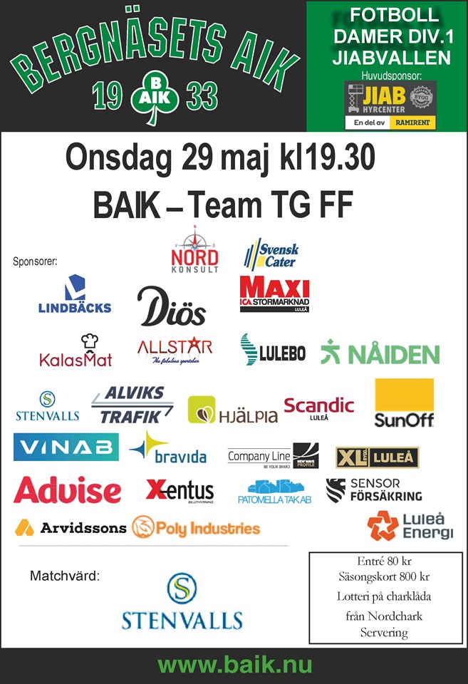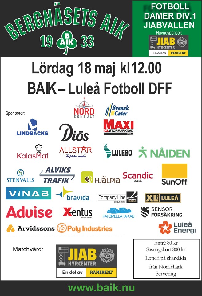 Lördag 18 maj kl. 12.00 möter BAIKs damer Luleå Fotboll DFF på JIABvallen. Luleå Fotboll DFF har gjort det bra hittils och samlat ihop 8 poäng vilket ger sjätteplats i dagsläget. Hemmalaget har genom två viktiga vinster skrapat ihop 6 poäng och ligger tia. Vi ser fram emot en riktigt tuff och spännande match med mycket känslor som det ska vara i ett derby! JIAB Hyrcenter står för värdskapet och charklådan kommer från Nordchark! Välkomna! Fotbollsektionen 15 maj 2024 0kommentarer