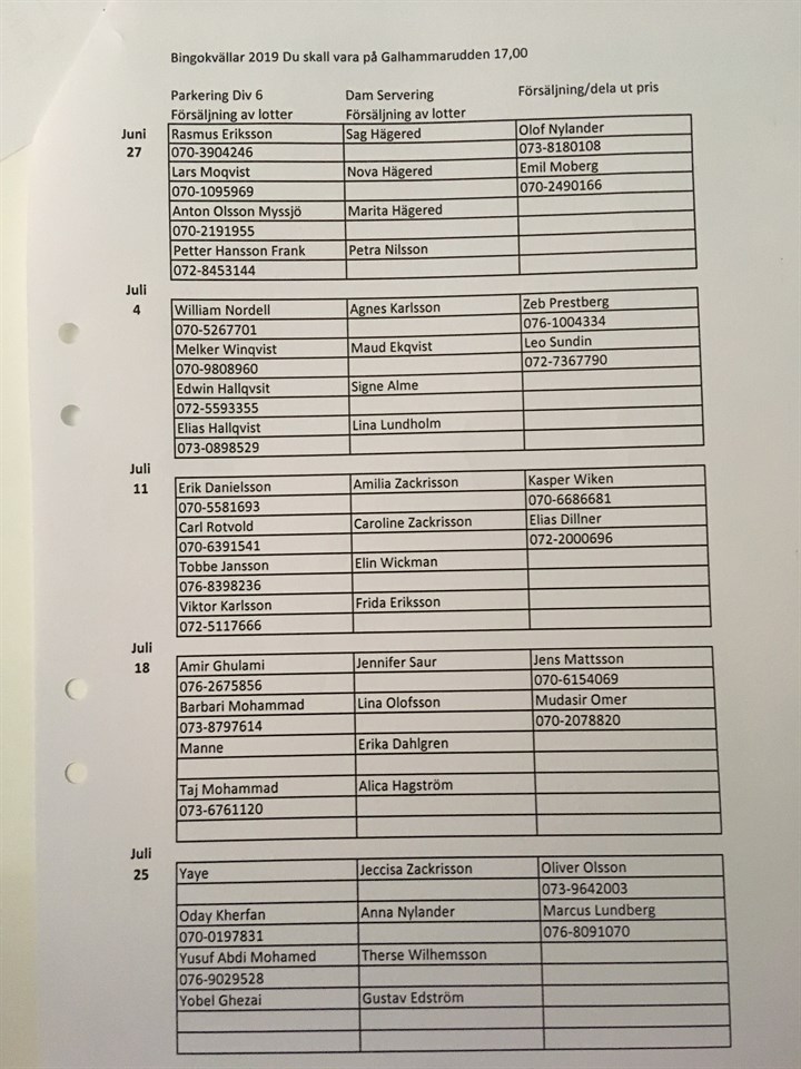 Här är jobblistan för bilbingon! Kan man inte byter man eller skickar dit nån annan kompis, släkting m.m Kan juh även finnas nån i laget som kan ta ett extra pass mot betalning. Viktigt iår att vi kommer till 17:00 då vi även kommer att hjälpa till å sälja bingobrickor. När ni kommer dit söker ni upp bingochefen Micael Moberg. Herrlag div 3 16 jun 2019 0kommentarer