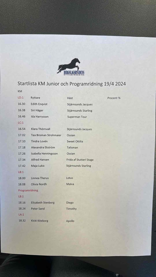 Här kommer en preliminär startlista till KM 19/4 för juniorer på Vagnsbrohagens Gård. Imorgon kl 12.00 läggs den ut igen med eventuella efteranmälningar. Vi säljer korv med bröd plus lättare fika och lotter med fina priser..kom gärna och heja fram våra ungdomar Bergslagsbygdens Ryttarförening 17 apr 2024 0kommentarer