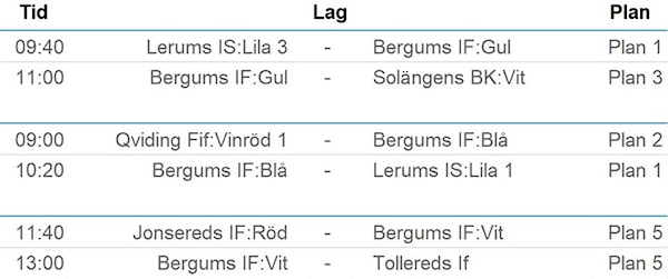 Ni ser spelschemat i bilden kopplet till nyheten. Lagen samlas på gräset bakom träläktaren 30 minuter före sin första match.