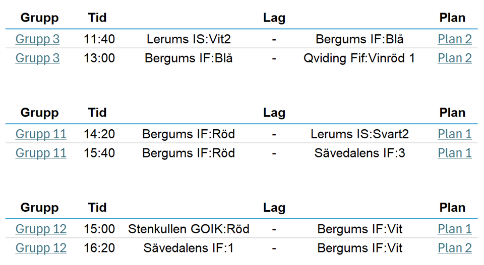 Vi spelar i huvudsak på eftermiddagen, och det är två matcher per lag. Lagen samlas på plats vid den aktuella planen senast 30 min innan första matchen. Jag vet inte hur det ser ut med parkeringar osv, men var på plats i god tid så ni hinner till planen till samlingstiden.