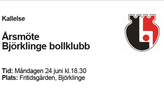 Tid: Måndagen 24 juni kl.18.30 Plats: Fritidsgården, Björklinge Årsmöteshandlingar finns tillgängliga hos styrelsen att få per mail, fr.om. 14 juni. Motioner till årsmötet ska inkomma per mail senast 13 juni. Sedvanliga årsmöteshandlingar enligt stadgar. Samtliga medlemmar inom BBK hälsas välkomna. Välkomna. Kontaktuppgifter www.laget.se/Bjorklingebk_ styrelsen@bjorklingebk.se Björklinge BK 3 jun 2024 0kommentarer