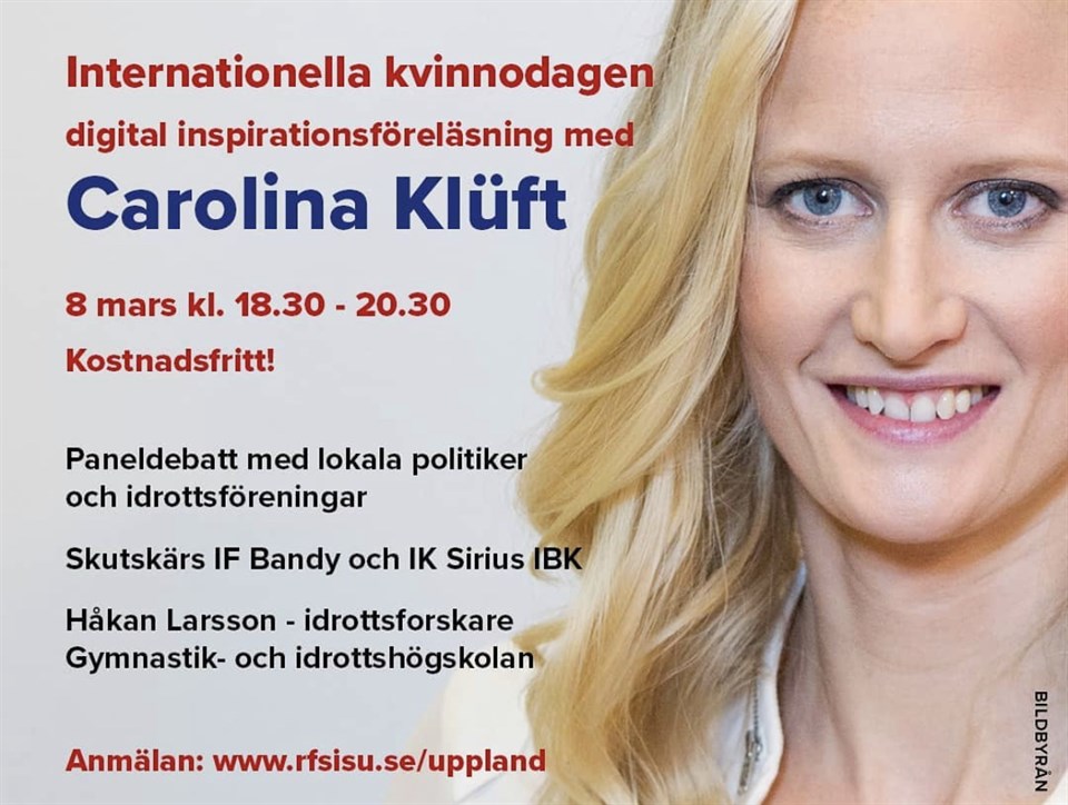 RF-SISU Uppland i samarbete med Uppsala kommun, bjuder in till en inspirationsföreläsning med Carolina Klüft, en av våra populäraste idrottsprofiler och verksamhetschef för Generation Pep! Skutskär Bandy och IK Sirius IBK gästar tillsammans med lokala politiker och idrottsforskare Håkan Larsson från Gymnastik och idrottshögskolan. Inspirationsföreläsningen är ett perfekt tillfälle för dig som behöver samla ny kraft och inspiration under dessa pandemi-tider. Alla är välkomna, föreläsningen är gratis. Anmäl dig här https://educationwebregistration.idrottonline.se/home/index/1483861