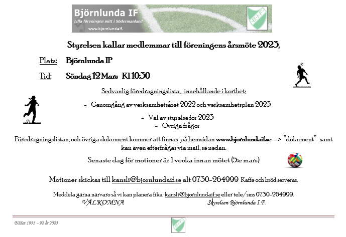 • Kallelse: Björnlunda IF Årsmöte 2023