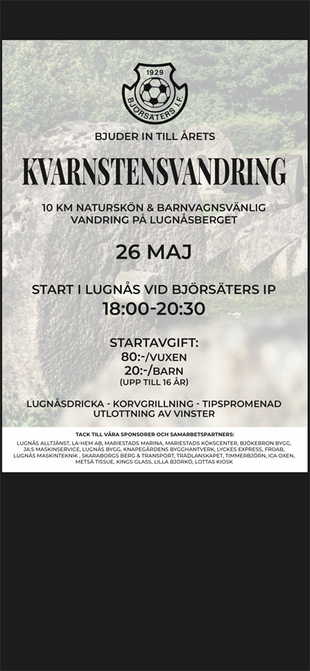 Om drygt en månad så är det dax för våran kvarnstensvandring. Fredagen den 26/5 är det dax. Björsäters IF 23 apr 2023 0kommentarer