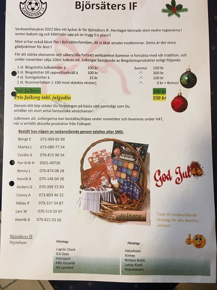 Även i år säljer vi julkorgarna och julbrev med bingolotter till uppesittarkvällen. Vi säljer såklart även lösa lotter. Lottas kiosk & mini livs är med även i år och sponsrar korgar och godis. Tackar oxå nimbus, hälsofoten, affis keramik, Ica oxen, Lugnås chark, nöjeslokalen, AQ lyrestad, kinnex , Intersport för priser till extra lotteriet som ingår gratis vid köp av korg el brev. Björsäters IF 13 nov 2022 0kommentarer