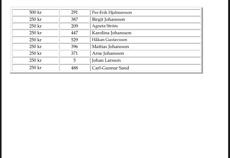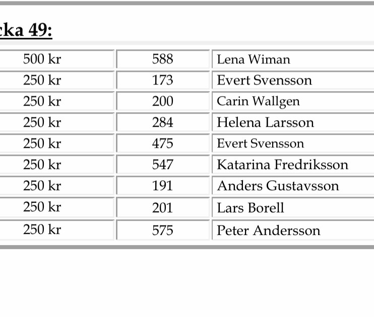 Vi kan nu presentera vinnarna av nummerlotteriet som ingick i den julkorg/julbrev vi sålt nu inför jul. Vinsterna får ni av den ni köpt korgen/brevet av. Vinst. lottnummer. Vinnare. Presentkort Hälsofoten. 98. Ulf Andersson. Affis Keramik. 66. Marie Tordby. Julkorg. 64. Susanne Ryd. P-kort 250kr petterssons chark. 46. Lars Carlsson. P-kort 250kr petterssons chark. 90. Irene Martinsson. P-kort 250kr petterssons chark. 16. Mattias Lindh. P-kort 250kr petterssons chark. 84. Tomas Pettersson. P-kort 200kr ICA oxen. 9. Carl-Henrik Bergkvist. P-kort 200kr ICA oxen. 18. Monica Keskisarja. P-kort 200kr ICA oxen. 36. Karl-Axel Friberg. P-kort 200kr ICA oxen. 73. Carl-Heenrik Bergkvist. P-kort 150kr Ullervads handels trädgård. 99. Martina Ekfeldt. Kasse från Staples. 2. Christer Henriksson. Kasse från Staples. 86. Carl-Henrik Bergkvist. Present påse från Apoteket Hjärtat. 30. Daniel Fågelfält. Present påse från Apoteket Hjärtat. 23. Carl-Henrik Bergkvist. 2 handukar från Nimbus. 47. Mia Kornblad/olsson. 2 handukar från Nimbus. 74. Carola Granfors. 2 handukar från Nimbus. 4. Birgit Gustafsson. 2 handukar från Nimbus. 3. Tobias Holm. Paraply från Nimbus. 37. Åke Mathiasson. Paraply från Nimbus. 69. Mikael Olofsson. Paraply från Nimbus. 19. Lars-Åke Larsson. Paraply från Nimbus. 6. Rem Larsson. Paraply från Nimbus. 91. Marianne Broo. Stort Grattis till alla som vinnit! Samt ett STORT TACK till alla sponsorer! Lottas Kiosk & Mini Livs Hälsofoten Affis Kermik Petterssons charkuteri ICA OXEN Ullervads Handelsträdgård Staples Apoteket Hjärtat Nimbus Björsäters IF 25 dec 2021 0kommentarer