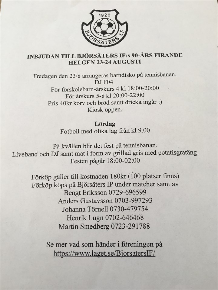 Som sagt så firar Björsäters IF 90år i år å det ska givetvis firas. Det stora firandet kommer äga rum helgen 23-24/8.. 100 platser finns på lördagen å det är först till kvarn som gäller! Se bifogad bild för mer info! Björsäters IF 4 jun 2019 0kommentarer