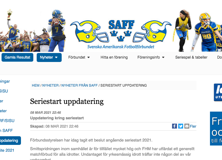 Det är många frågor kring FS beslut om seriestart och likaså kring vad som krävs för att vi ska kunna börja träna med kontakt och och spela matcher dvs gå till fas 1. Nedanstående är ett försöka att reda ut dessa frågetecken. Elit Superseriedam herr och dam är kategoriserad elit vilket ger oss rätt att boka träningsplaner och träningslokaler. Yrkesmässig RF har ett ramverk där de bla definierat vad som är yrkesmässig idrott. Detta ramverk såsom det är formulerat gör det tydligt att vi som idrott inte betraktas som yrkesmässig. Detta innebär då att vi inte kan undantas från restriktionerna som gäller då detta endast kan göras för yrkesmässig idrott. RF:s Ramverk SAFF:s Coronaprotokoll Vad behöver hända innan vi kan gå till fas 1 och få träna med kontakt och spela matcher? Om RF:s ramverk är samma dvs att definitionen på yrkesmässig idrott kvarstår så behöver FHM/RF ändra sina rekommendationer för att vi som idrott kan gå till fas 1. Vaccinering har kommit igång och vi ser positiv utveckling för de målgrupper som tagit vaccinen. När vaccinationen ökar och når andra målgrupper så kommer smittspridningen och dödlighet att minska. I kombination med vårvärme och förhoppningsvis att vi som befolkning följer de uppsatta rstriktionerna så att smittspridningen minskar. Det är rimligt att se att vi kommer få en positiv utveckling de kommande veckorna så att FHM kan lindra på rekommendationerna så att vi som sport kan gå till fas 1. Herrlaget behöver minst 2 veckor med kontakt för att kunna spela första seriematchen. FÖr att vi ska kunna spela final 10-11/7 och med full grundserie så skulle vi behöva f klartecken till fas 1 vecka vecka 17-18