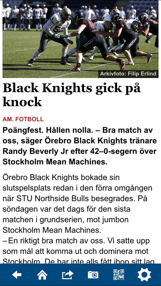 Poängfest. Hållen nolla. – Bra match av oss, säger Örebro Black Knights tränare Randy Beverly Jr efter 42–0-segern över Stockholm Mean Machines. "Black Knights gick på Knock" Elit-lag Herr 24 aug 2015 0kommentarer