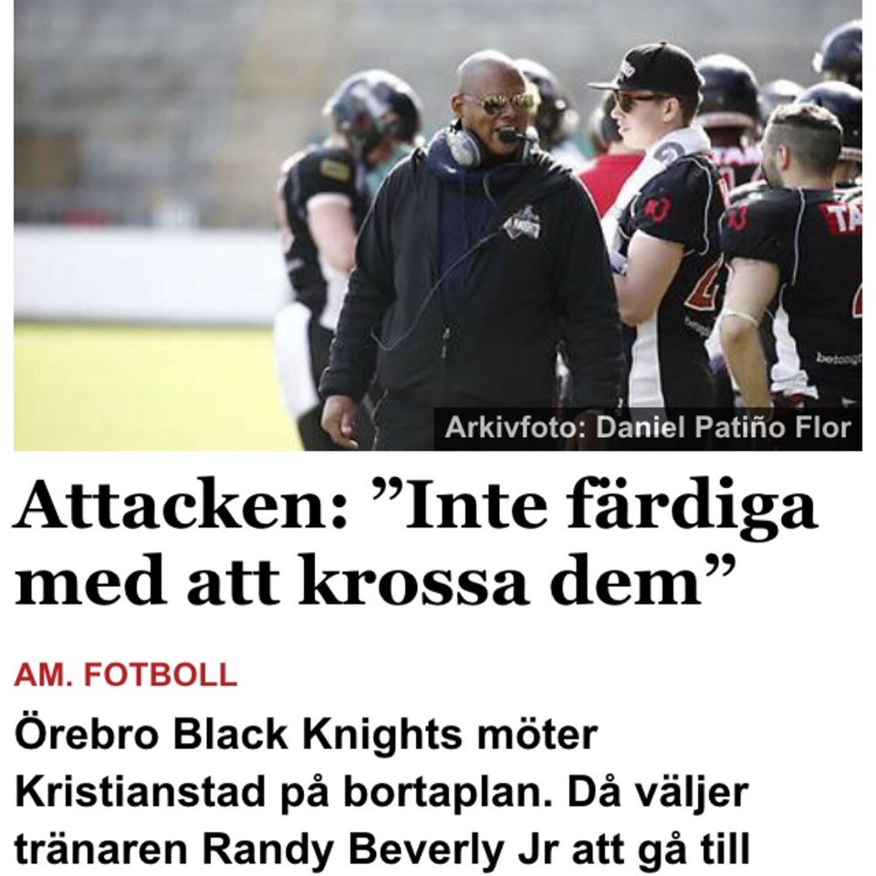 Viktig match lördag kl 16:00 på bortaplan mot Kristianstad Predators. En måste match för Kristianstad för att ha chans på slutspel. För Black Knights är den viktig av samma anledning. I föra matchen vann vi med 9-6 i en tät drabbning. Kristianstad har ett explosivt offense som endast lyckades göra en touchdown på ett spel efter ett stort misstag av Black Knights då snapp till puntern gick över huvudet och KP fick lysande fieldposition. Vår HC, Randy beverly Jr, var inte imponerad över hur Kristianstads spelare och coacher uppträdde inför, under och efter matchen senast. Detta är tydligt i den preview som vi släppte igår fredag Preview. Det går också att läsa delar av denna preview i NA web NA rapporterar NA: Attacken: ”Inte färdiga med att krossa dem” En viktig match med heta känslor innan match är helt klart. Frågan är hur dessa överförs till själva matchen. Matchen kommer att LIVESTREAMAS LIVESTREAM