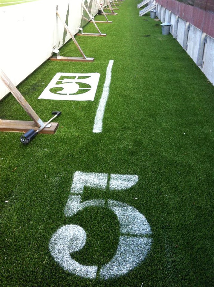 Siffror I år tar vi nästa steg i att utveckla upplevelesen för spelare och publik på våra matcher. Vi har till i år tagit hem mallar för att markera var tionde yardlinje på båda sidor. 10, 20, 30, 40, 50. Dessa har vi testat i dag på Behrn. Det kommer att bli bra detta. 5-Yards linjer Vi kommer att måla upp 5-yards linjer till årets matcher. Uardlinjer Vi har även tillverkat en mall så vi kan markera upp yardlinjer läng sidlinjen samt mellan hashmarks. Förhoppningen är att även detta testas till vår hemmapremiär 23/5 mot Uppsala 86ers. Borttagning Som vanligt kommer spelare och ledare efter matchen behöva arbeta med borttagningen av dessa nya linjer.