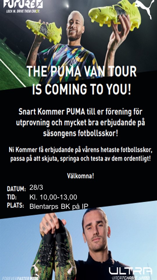 söndagen den 28/3 kl 10:00-13:00 kommer PUMA till IP med en lastbil full av fotbollsskor. Blentarps BK's medlemmar får 40 % rabatt, även på de nya modellerna, så passa på!