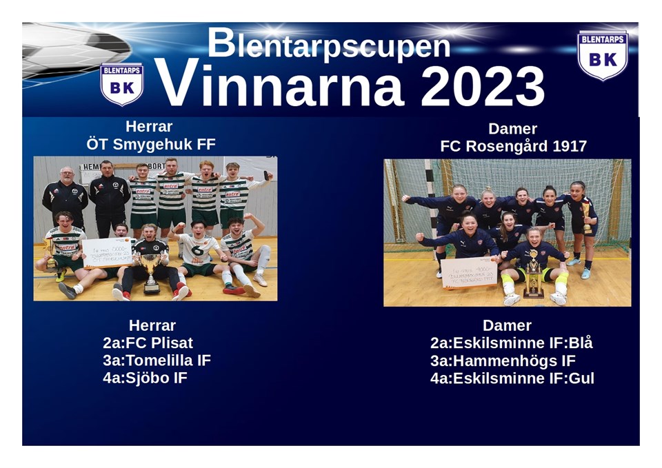 Blentarpscupen 2023 Vi i Blentarps BK vill tacka alla spelare och ledare, supportrar, funktionärer och sponsorer för ert deltagande i Blentarpscupen 2023! Resultat: Damer 1:a FC Rosengård 1917 2:a Eskilsminne IF:Blå 3:a Hammenhögs IF 4:a Eskilsminne IF:Gul Herrar 1:a ÖT Smyhehuk FF 2:a FC Plisat 3:a Tomelilla IF 4:a Sjöbo IF Pris för bästa målvakt och bästa spelare utdelades till följande deltagare: Bästa målvakt dam: Alma Karlsson Eskilsminne IF:Blå Bästa målvakt herr: Melker Olsson Sjöbo IF Bästa spelare dam: Hanna Jensen FC Rosengård Bästa spelare herr: Markus Lundell ÖT Smygehyk FF Fullständiga resultat finns på: https://www.procup.se/cup/35817.htm Blentarps BK