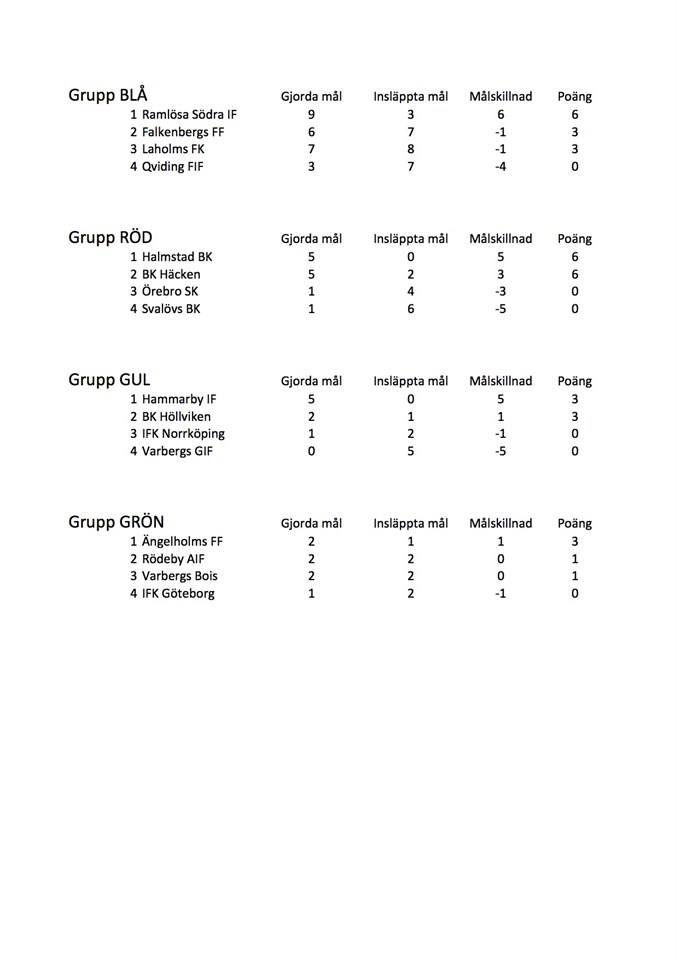 På bilden finner ni ställningen i respektive grupp kl 13:00 när hälften av gruppspelsmatcherna spelats. Bockstenscupen 8 okt 2016 0kommentarer