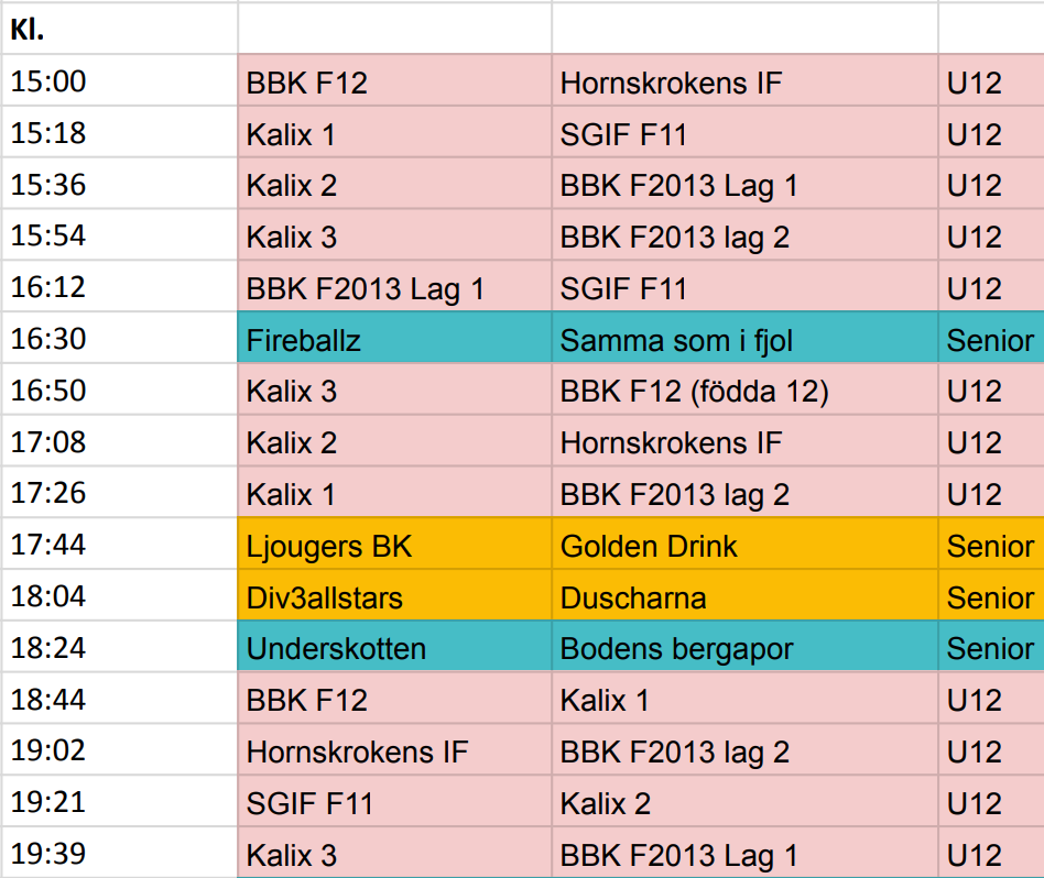 Båda lagen samlas imorgon 15 10 bredvid planen. Därefter sker samling 10 min före match på sidan av planen. Vi spelar i den gröna BBK-träningströjan så se till att den är med! Matcherna är 2x7 min. Vi kommer att försöka spela med "flygande målvakt", precis som tjejerna fick pröva på träningen senast. Det blir kul :) Lag 1 Svea Olivia Ingrid Kerstin Lova Ellen Thea Lag 2 Tilda Lovisa Ester Ida Alicia Alice Hör av er om det är några funderingar.