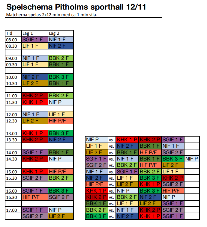 Som ni ser blir det en ganska lång dag med vissa större glapp mellan matcherna och efter sista matchen. Tyvärr har Strömnäs bara en plan, men vi får gilla läget. Förhoppningsvis kan tjejerna roa sig mellan matcherna. Det finns åtminstone gott om tid för lunch! BBK 1: 09:30, 10:30, 14:00 Ida Lindqvist Thea Rutström Lilly Wahlberg Alice Kurkinen Wilma Olofsson Alicia Lindholm Molly Asplund Ellen Vestin BBK 2: 09:00, 11:00, 15:30 Lova Andersson Alicia Mannberg Lovisa Johansson Molly Forsberg Meja Bancescu Emma Marmdahl Victoria -Lynn Engman BBK 3: 10:00, 13:00, 16:00 Ida Eriksson Olivia Mannberg Ingrid Adling Ester Eriksson Svea Söderström Alicia Forsman Kerstin Sundholm Tilda Nystedt BBK 1: 09:30, 10:30, 14:00 BBK 2: 09:00, 11:00, 15:30 BBK 3: 10:00, 13:00, 16:00 Matcherna är 2x12 min. Respektive lag samlas 15 min före match. Jag tror att det ska finnas ytor att värma upp på innan man kommer ut på planen. Väl ute på planen kommer det bara vara några skott på målvakten och sen drar matchen igång. Kontakta Jesper för eventuella funderingar. /Tränarna