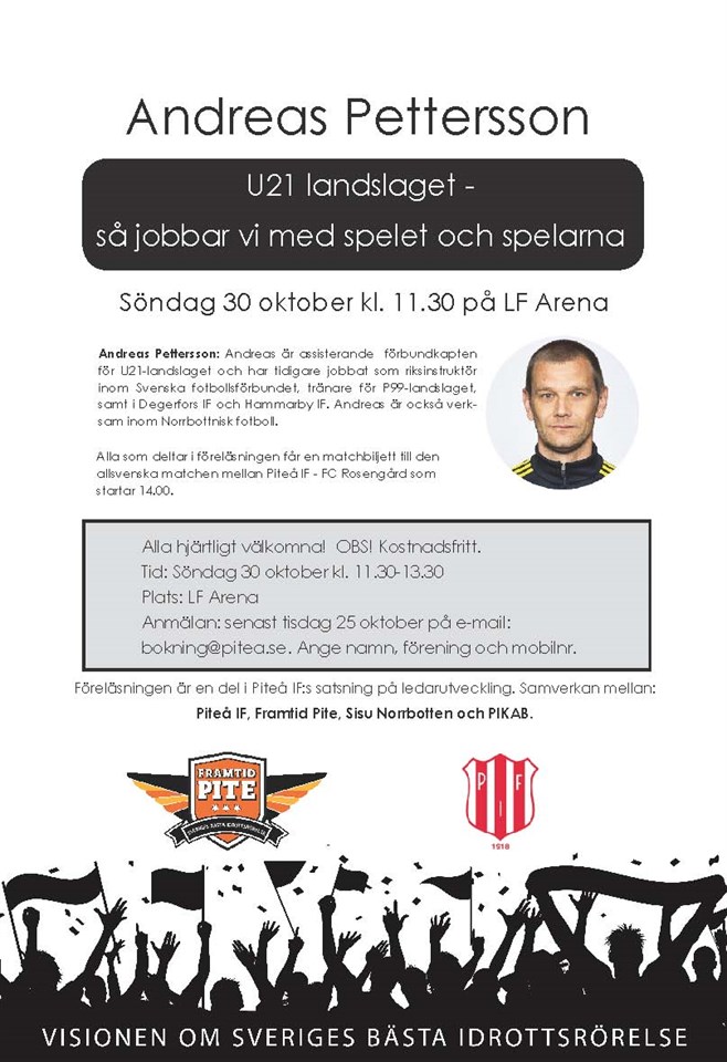 Ta chansen och lyssna på Andreas Pettersson (förbundskapten U:21 herrar) samt titta på allsvenskan mellan PIF-Rosengård. Alla hjärtligt välkomna! OBS! Kostnadsfritt. Tid: Söndag 30 oktober kl. 11.30-13.30 Matchen börjar 14.00. Plats: LF Arena Anmälan: senast tisdag 25 oktober på e-mail: bokning@pitea.se. Ange namn, förening och mobilnr. Bölebyn SK 25 okt 2016 0kommentarer
