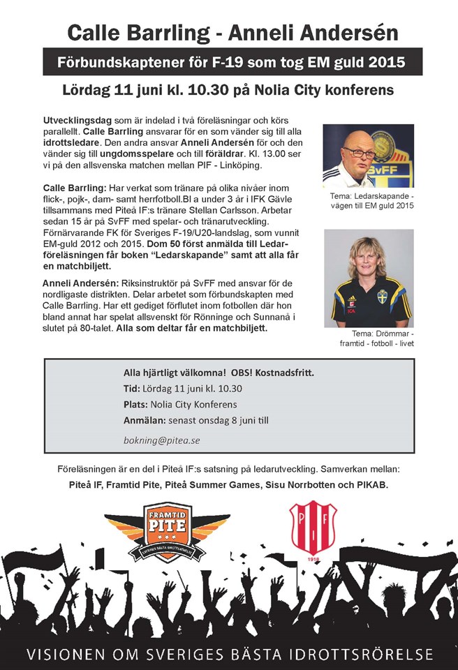 Föreläsning Nolia City samt match PIF - Linköping lördag 11 juni med start 10.30. Förbundskaptenerna för EM-guldlaget F-19 Calle Barrling och Annelie Andersén föreläser. Mer info på den bifogade informationen. Styrelsen Bölebyn SK 31 maj 2016 0kommentarer
