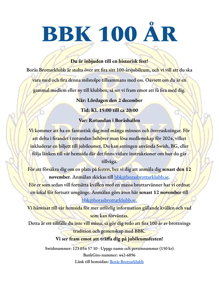 Du är inbjuden till en historisk fest! Borås Brottarklubb är stolta över att fira sitt 100-årsjubileum, och vi vill att du ska vara med och fira denna milstolpe tillsammans med oss. Oavsett om du är en gammal medlem eller ny till klubben, så ser vi fram emot att få fira med dig. När: Lördagen den 2 december Tid: Kl. 15:00 till ca 20:00 Var: Rotundan i Boråshallen Vi kommer att ha en fantastisk dag med många minnen och överraskningar. För att delta i firandet i rotundan behöver man lösa medlemskap för 2024, vilket inkluderar en biljett till jubileumet. Du kan antingen använda Swish, BG, eller följa länken till vår hemsida där det finns vidare instruktioner om hur du går tillväga. För att försäkra dig om en plats på festen, ber vi dig att anmäla dig senast den 12 november. Anmälan skickas till bbk@borasbrottarklubb.se. För er som sedan vill fortsätta kvällen med en massa brottarvänner har vi ordnat en lokal för fortsatt umgänge. Anmälan görs även här senast 12 november till bbk@borasbrottarklubb.se. Vi hänvisar till vår hemsida för mer utförlig information gällande kvällen och vad som kan förväntas. Detta är ett tillfälle du inte vill missa, så gör dig redo att fira 100 år av brottningstradition och gemenskap med BBK. Vi ser fram emot att träffa dig på jubileumsfesten! Swishnummer: 123 034 57 10 - Uppge namn och personnummer (150 kr) BankGiro nummer: 442-6896 Länk till hemsidan: Borås Brottarklubb Träning 27 okt 2023 0kommentarer